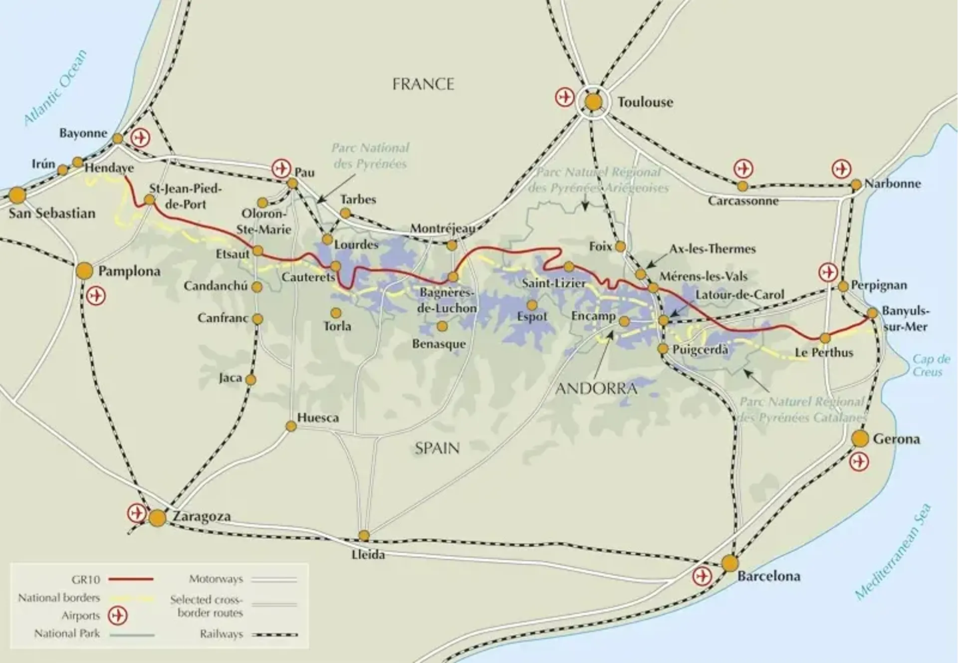 The GR10 starts with the rolling hills of the Basque country leading to the High Pyrenees including Pic du Midi d'Ossau, Vignemale and Gavarnie. The remote Ariège with Mont Vallier follows and Canigou dominates the approach to the Mediterranean. Wildflower meadows are magnificent throughout.