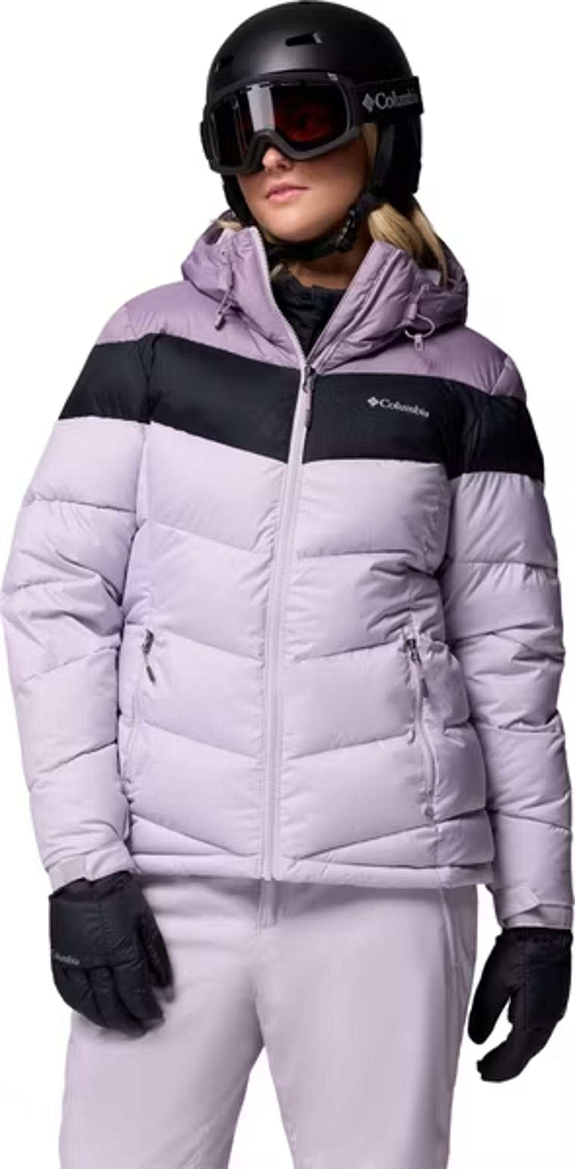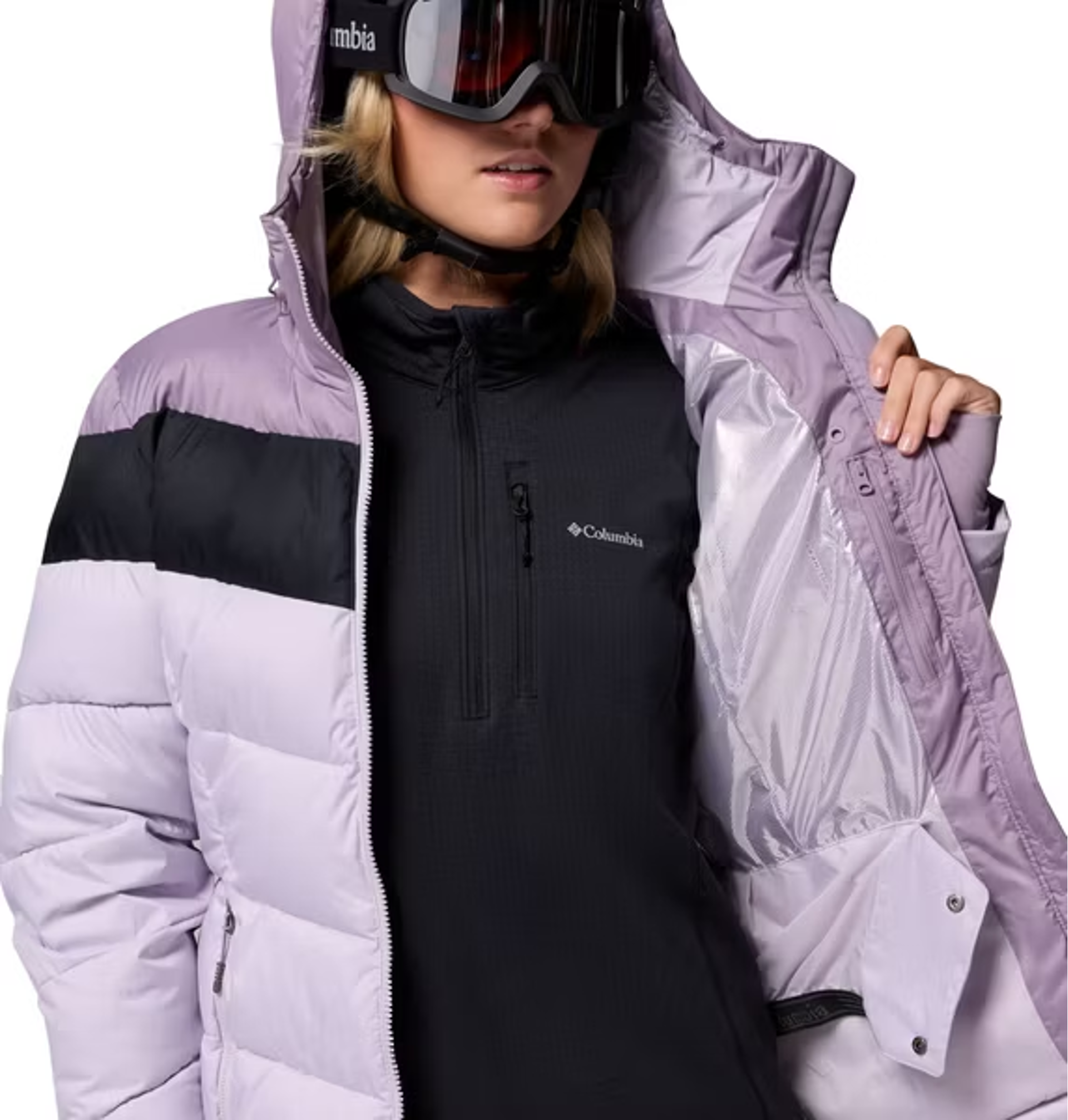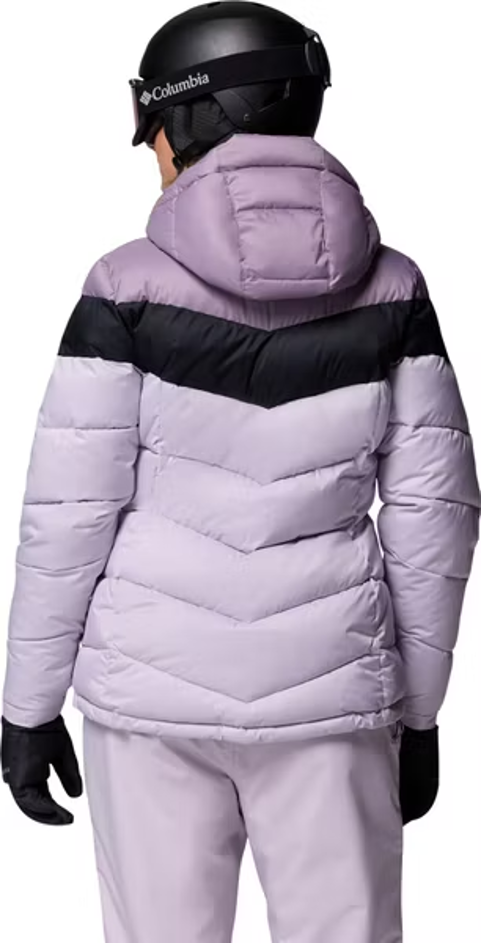 The Columbia Women's Abbott Peak II Insulated Jacket in Lavender Pearl/Shale Purple is a specialized, feature-rich ski jacket designed to provide warmth and protection on the slopes.