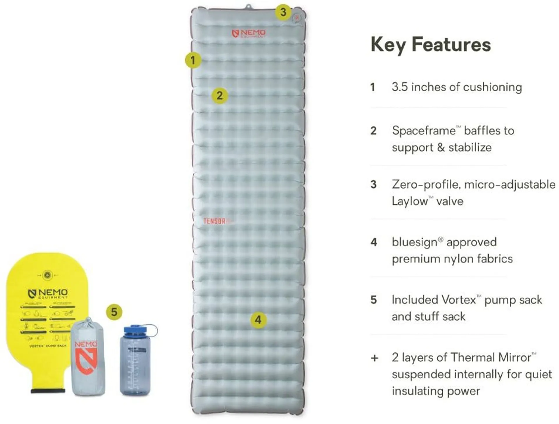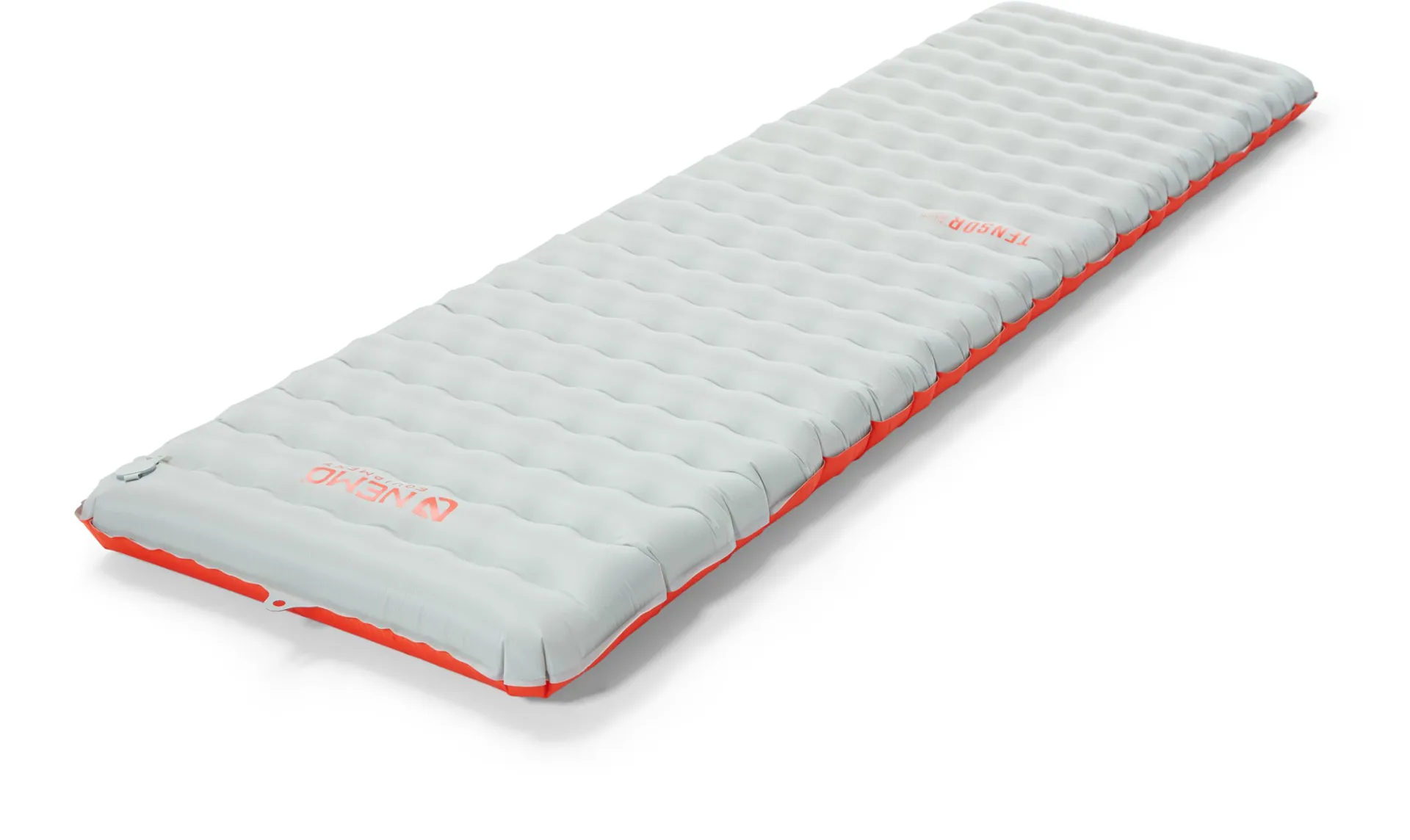 The pad’s interior features NEMO’s proprietary Spaceframe™ baffle design, which utilizes low-stretch fabric trusses to create stable support and offer just the right amount of give - all while avoiding any wobbly waterbed feeling. Inside each baffle are two suspended layers of ultra-thin, metallized Thermal Mirror™ film, which efficiently reflect body heat and contribute to the pad’s overall 5.4 R-value. The layers’ clever floating construction eliminates the crinkling, crunchy sound that many insulated air pads are known for, earning Tensor a reputation for peace and quiet on the trail.